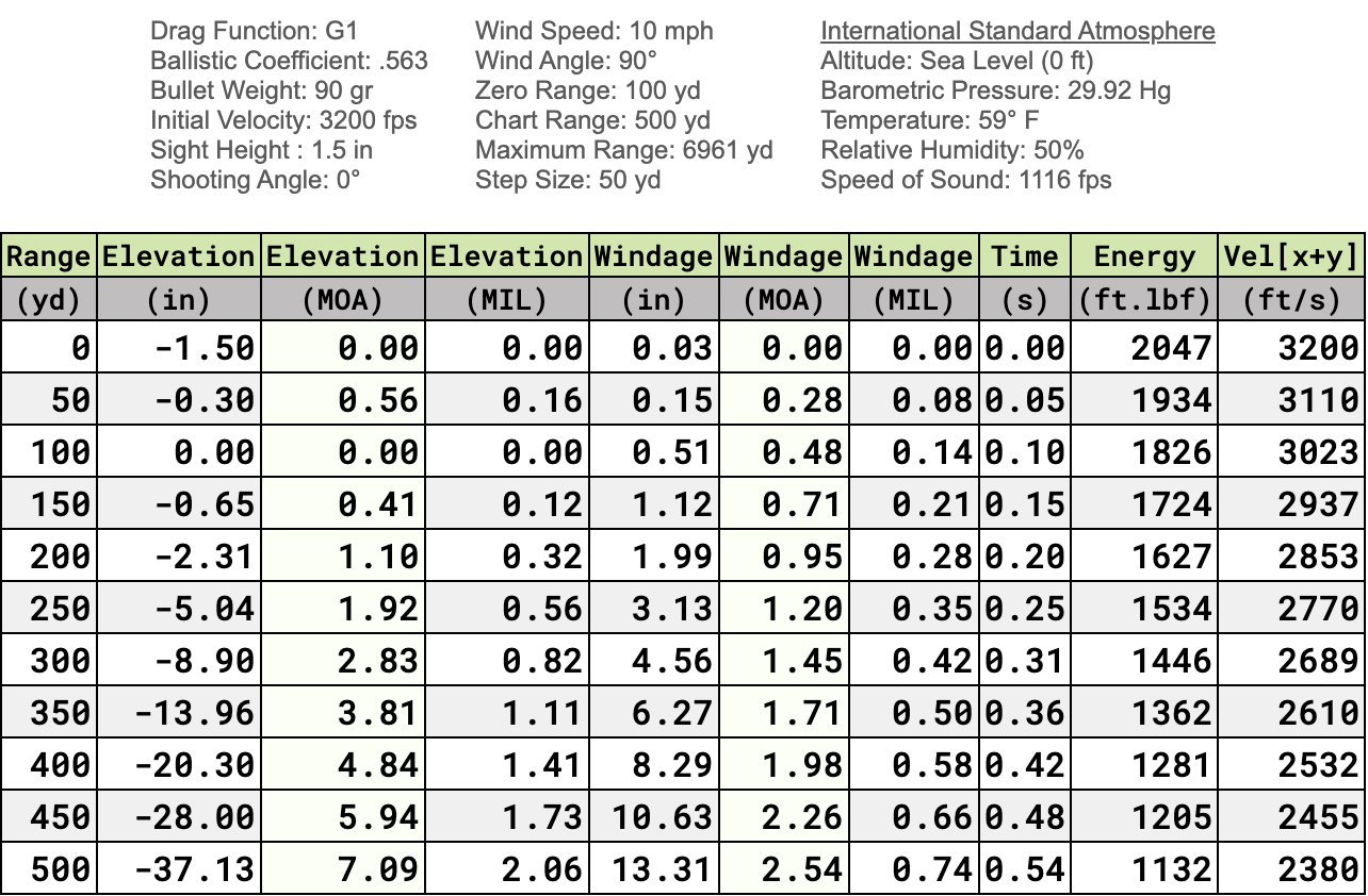 22 Creedmoor Ballistics Range Card
